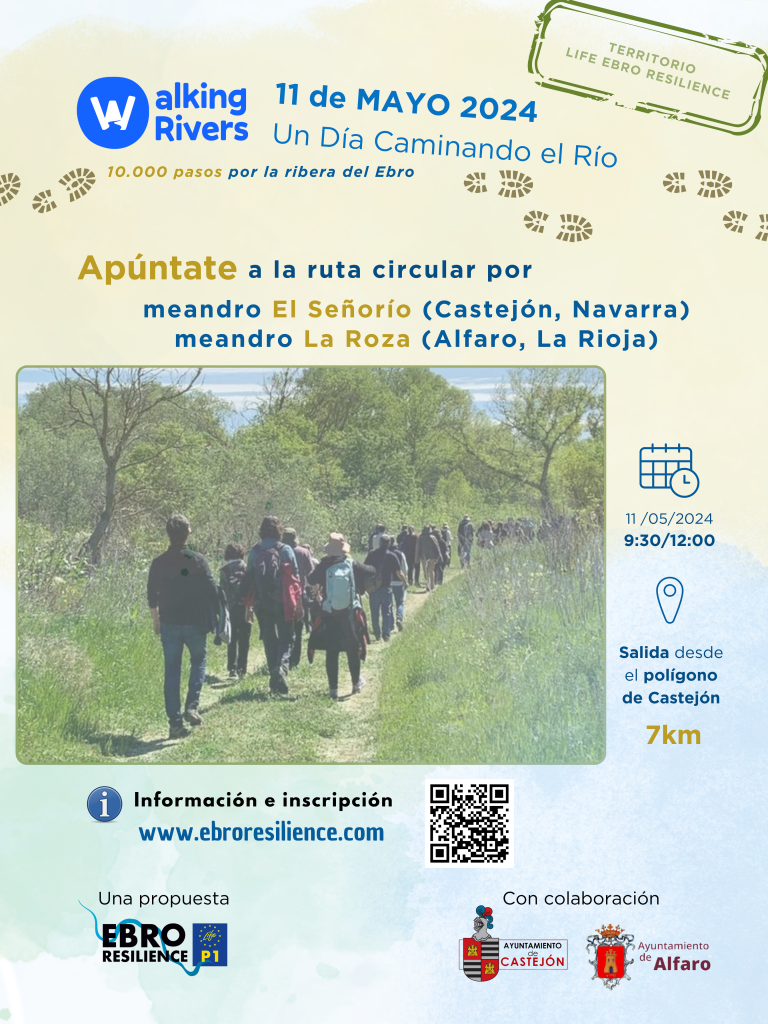 On May 11, we invite you to join us for a day of getting closer to the rivers. On the occasion of the global initiative WalkingRivers, on May 11 we have organized a circular route that will take us from the meander of El Señorío, in Castejón, Navarra, to the meander of La Roza, in Alfaro, in La Rioja.