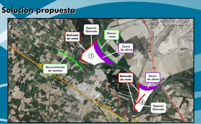 Dentro de la Estrategia Ebro Resilience se han estudiado varias alternativas de actuación. La más eficiente de las planteadas se basa en recrecer el camino de Alcalá a Cabañas, impidiendo el desbordamiento por margen derecha que afectaría al casco urbano de Cabañas de Ebro. Por otra parte consiste también en reducir la velocidad y el caudal de paso junto a las defensas del pueblo, ampliando la llanura de inundación mediante la retirada parcial de la mota en el meandro frente a la población y construyendo un cauce de alivio en el cuello del meandro.